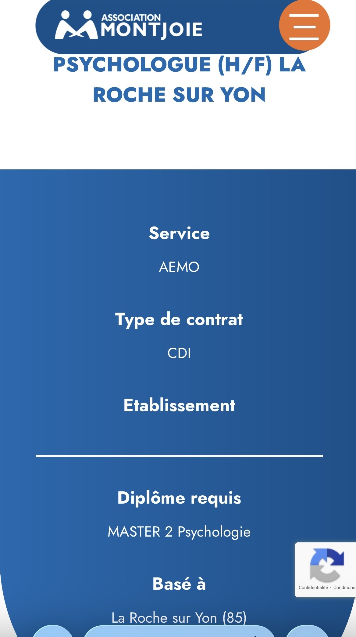 Notre structure partenaire L'association MONTJOIE recherche un Psychologue H/F. Le poste est à pourvoir rapidement pour leur nouveau service AEMO en Vendée.