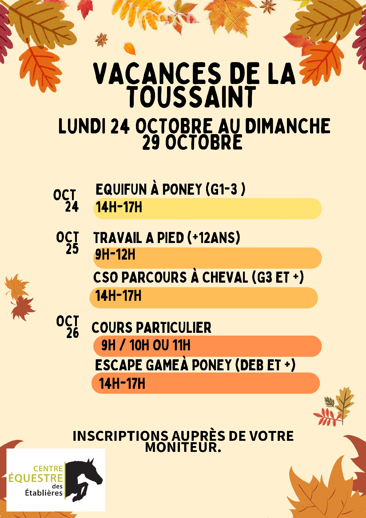 Le Centre Équestre est ravi de vous présenter son passionnant programme pour les vacances de la Toussaint. Que vous soyez un cavalier expérimenté ou débutant, notre programme a été conçu pour satisfaire toutes vos attentes et vous offrir des vacances inoubliables en compagnie de nos amis équins.